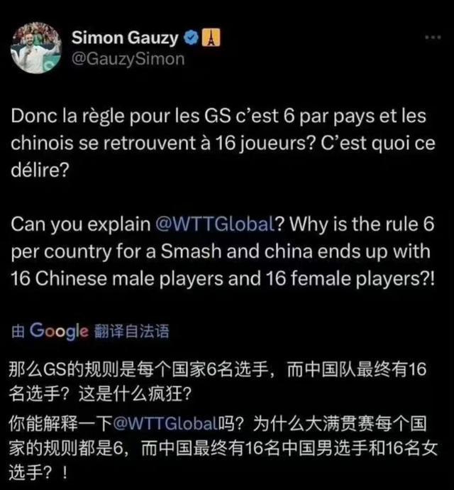 法国宿将西蒙高茨是国乒的老敌手,匡助球队在巴黎奥运会拿到了季军的得益!此前的结束的澳门冠军赛刚刚和梁靖崑交过手,惨遭绝杀。且归之后,看到中国大满贯赛把持方外卡名单公布,全是国乒小将,西蒙高茨开启了炮轰形状!