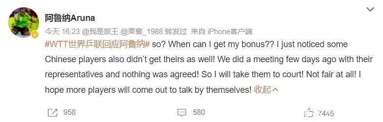 他写谈:是以我什么时候才调拿到奖金呢?我刚刚疑望到了,一些中国球员相通于今齐莫得得到他们的奖金,几天前,我与WTT宇宙乒联的代表举行了一次会议,但咱们两边并莫得完了任何左券,是以当今我要把他们告上法庭,因为这一切少许也不公谈,我也但愿更多的乒乓球走漏员能站出来为我方发声!